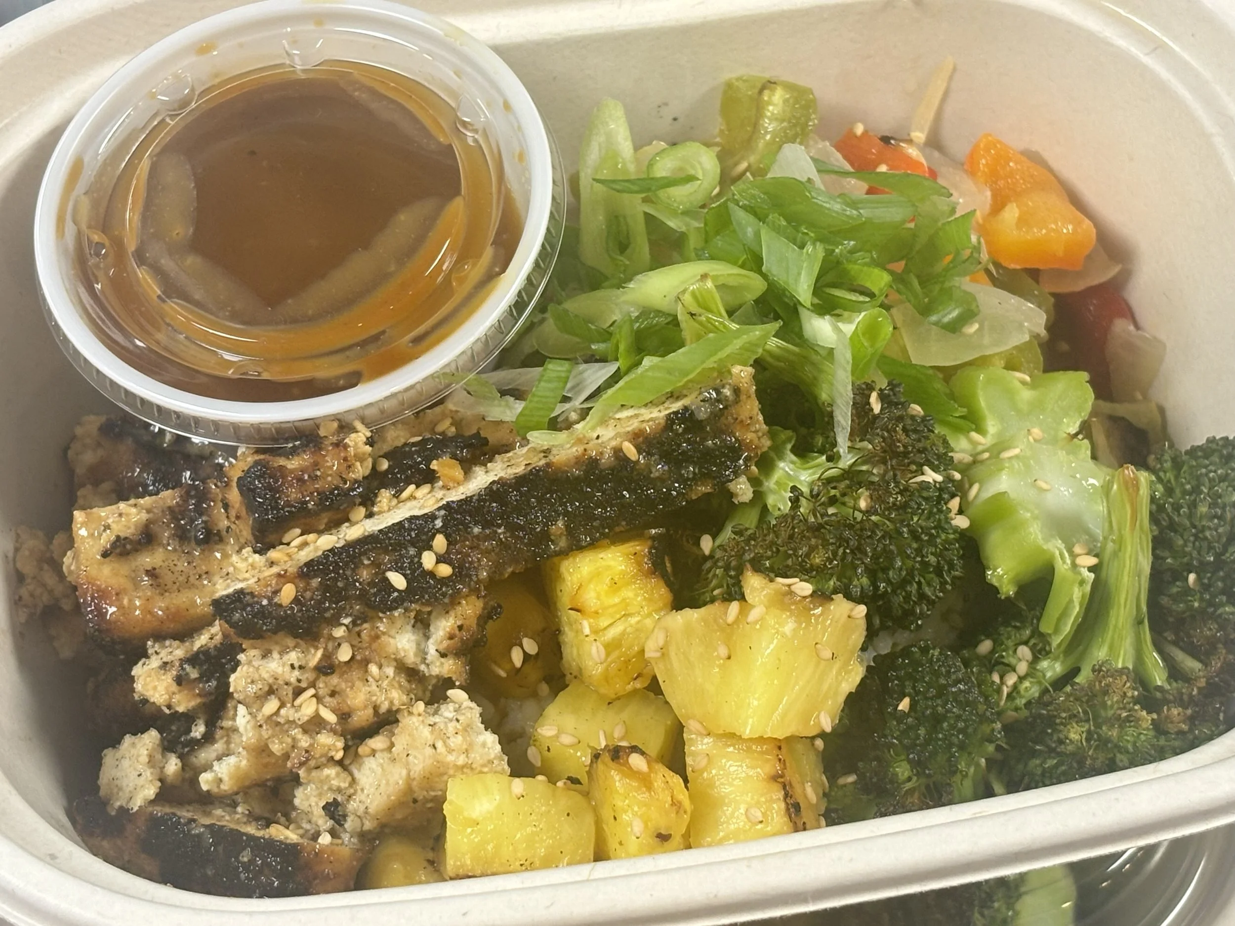 Toasted rice and quinoa, with sesame roasted broccoli, grilled pineapple, asparagus, bok choy, onions, baby corn and edamame, pickled cucumber and daikon radish, your choice of chicken or tofu (Vegan).